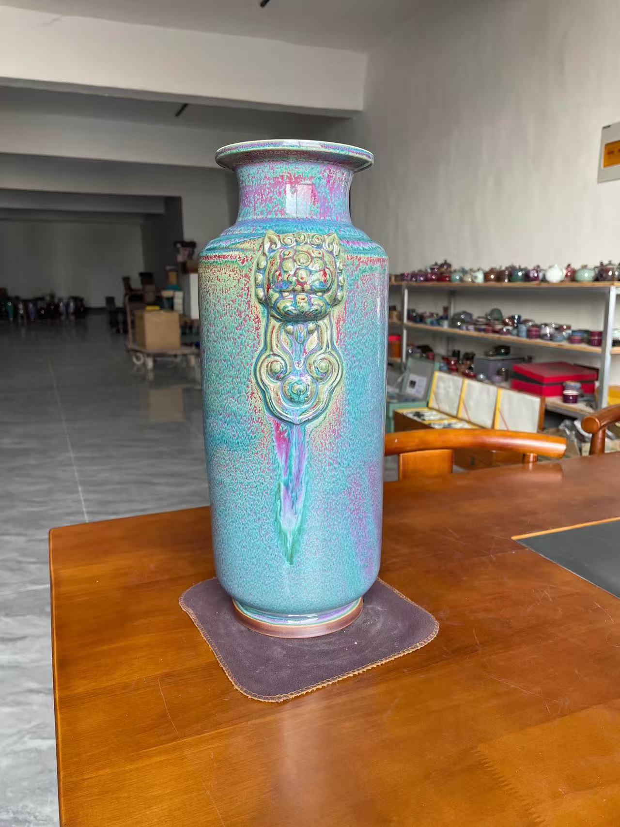 Handcrafted Yuzhou Jun Porcelain Vase with Beast Head Handles – Iridescent Kiln-Change Glaze Decorative Bottle