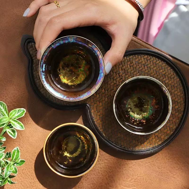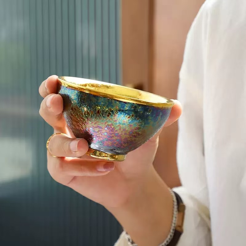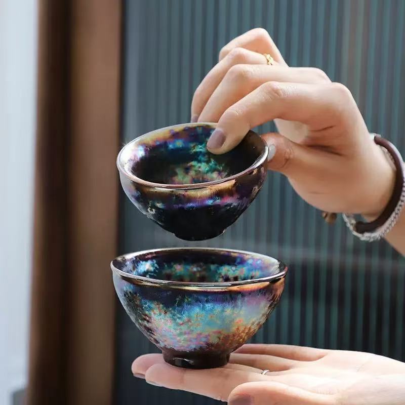 This teacup features a stunning iridescent kiln-transformed glaze, with a kaleidoscope of colors that shift and change in the light. The glaze is achieved through a complex high-temperature firing process, resulting in a unique, luminous finish that makes each piece one-of-a-kind.