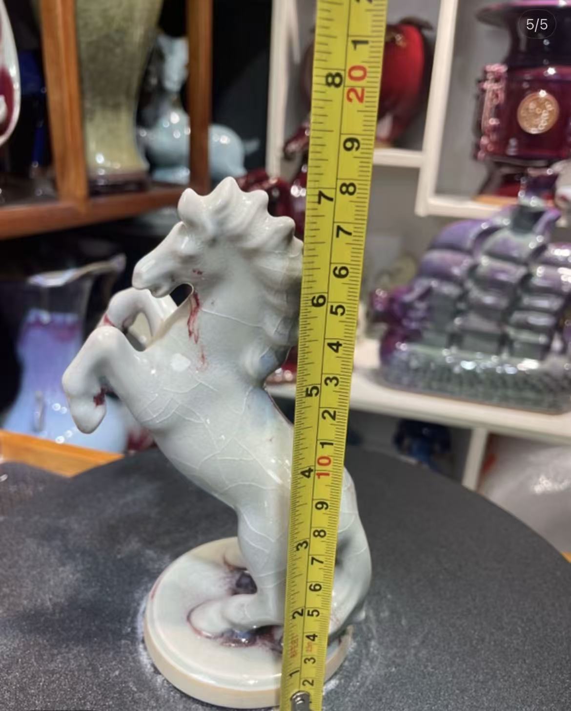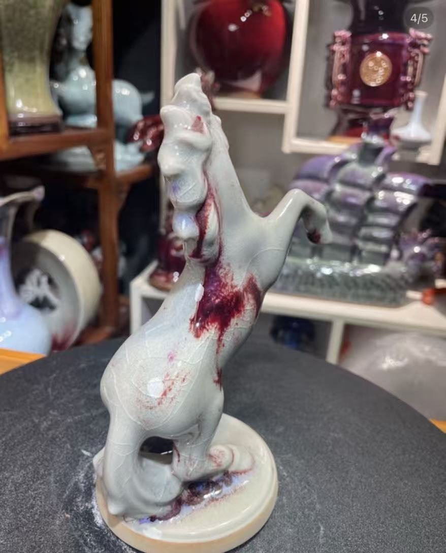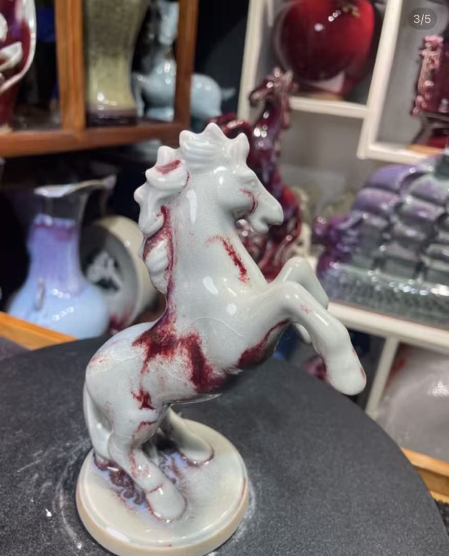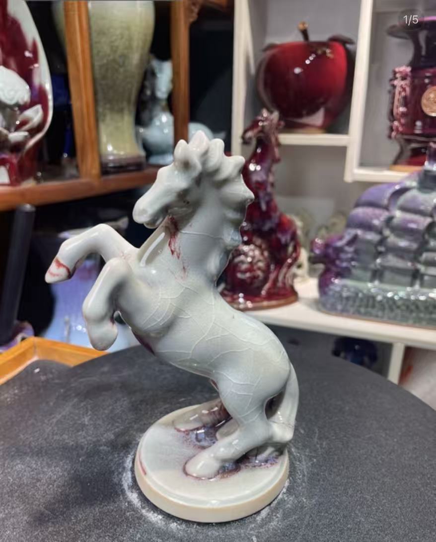 This magnificent horse sculpture is a masterpiece of traditional Jun porcelain, celebrated for its “one color into the kiln, ten thousand colors out” phenomenon. The stunning ice-crackle glaze, with its delicate web-like patterns and striking crimson accents, is formed naturally during the high-temperature firing process. Each piece is entirely unique, making it a one-of-a-kind work of art.