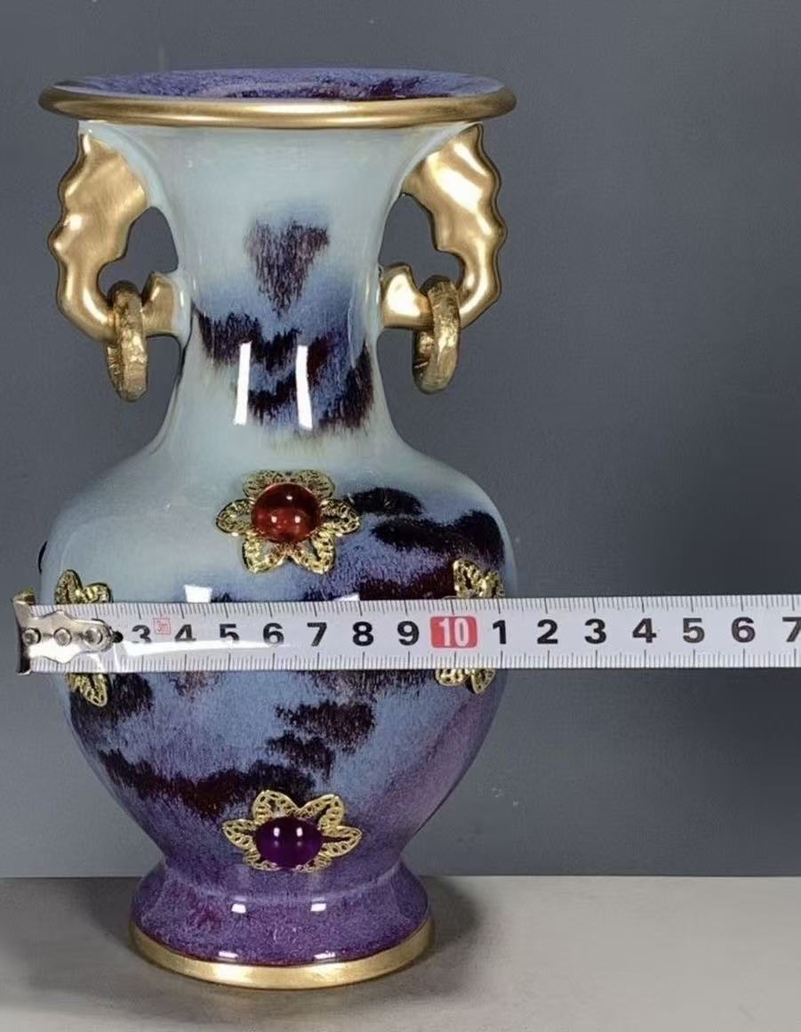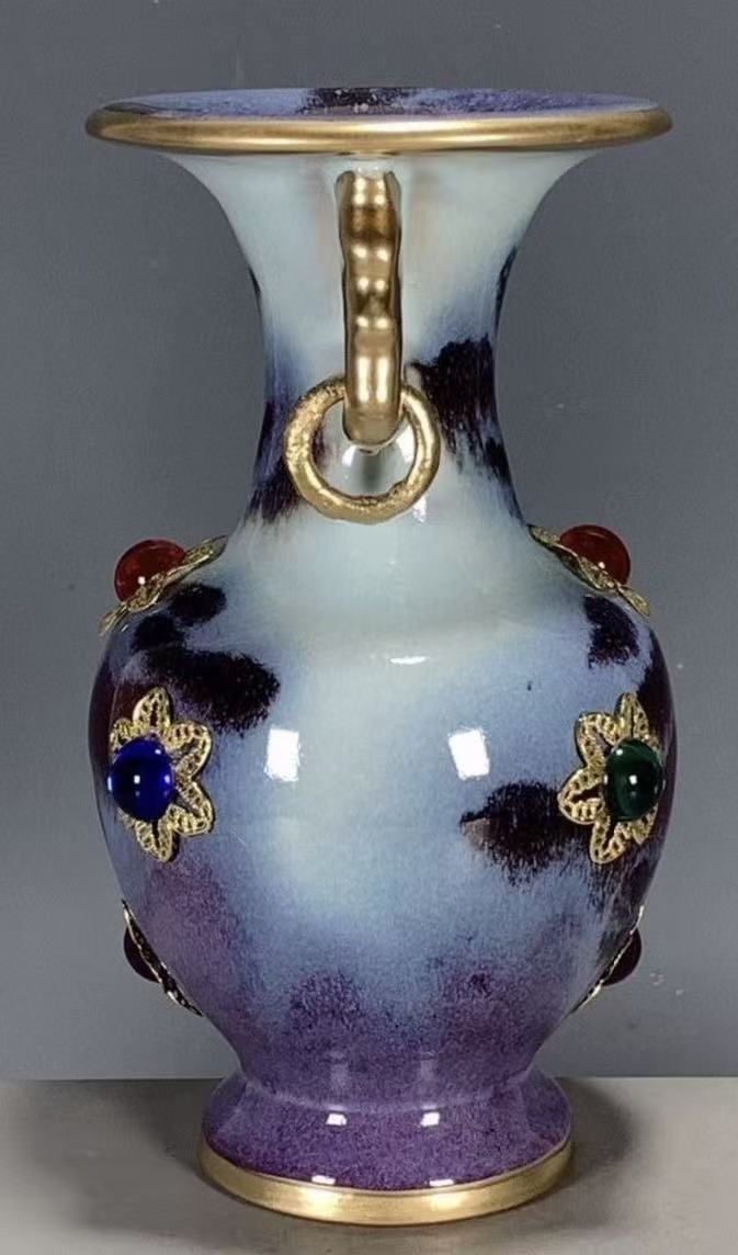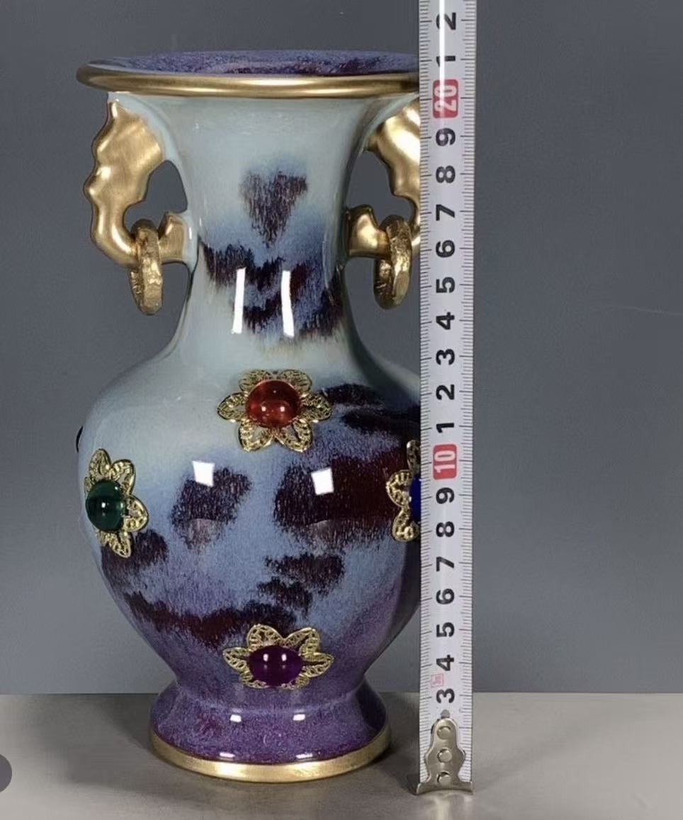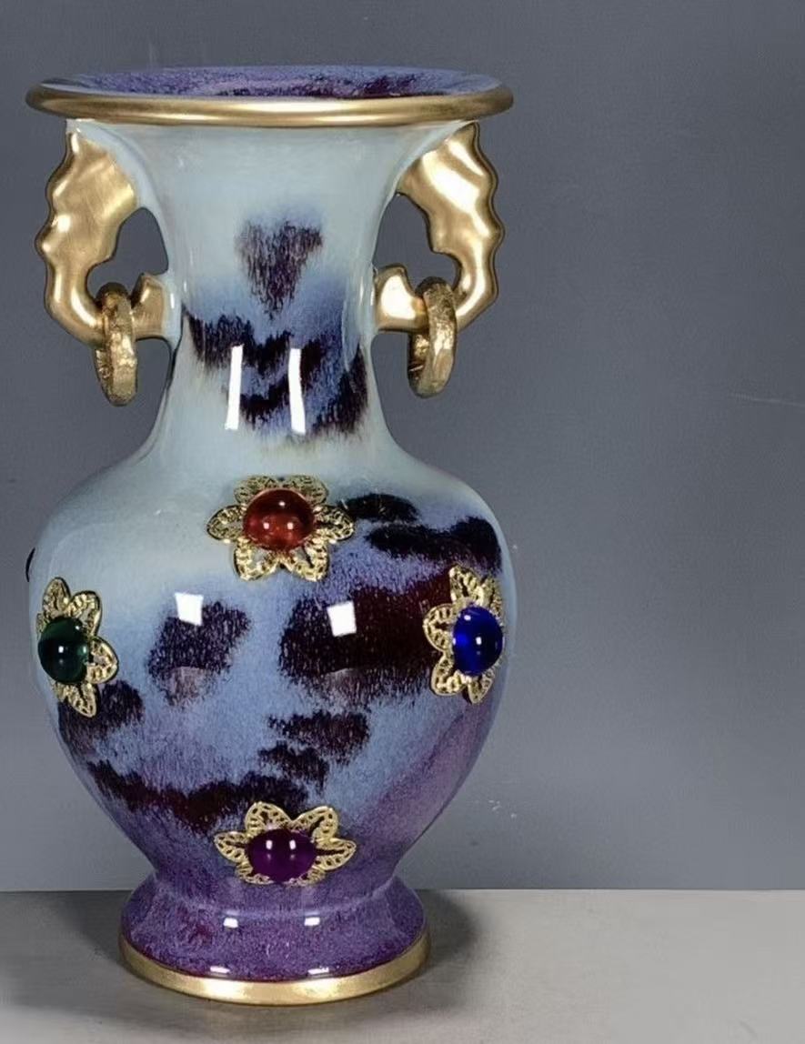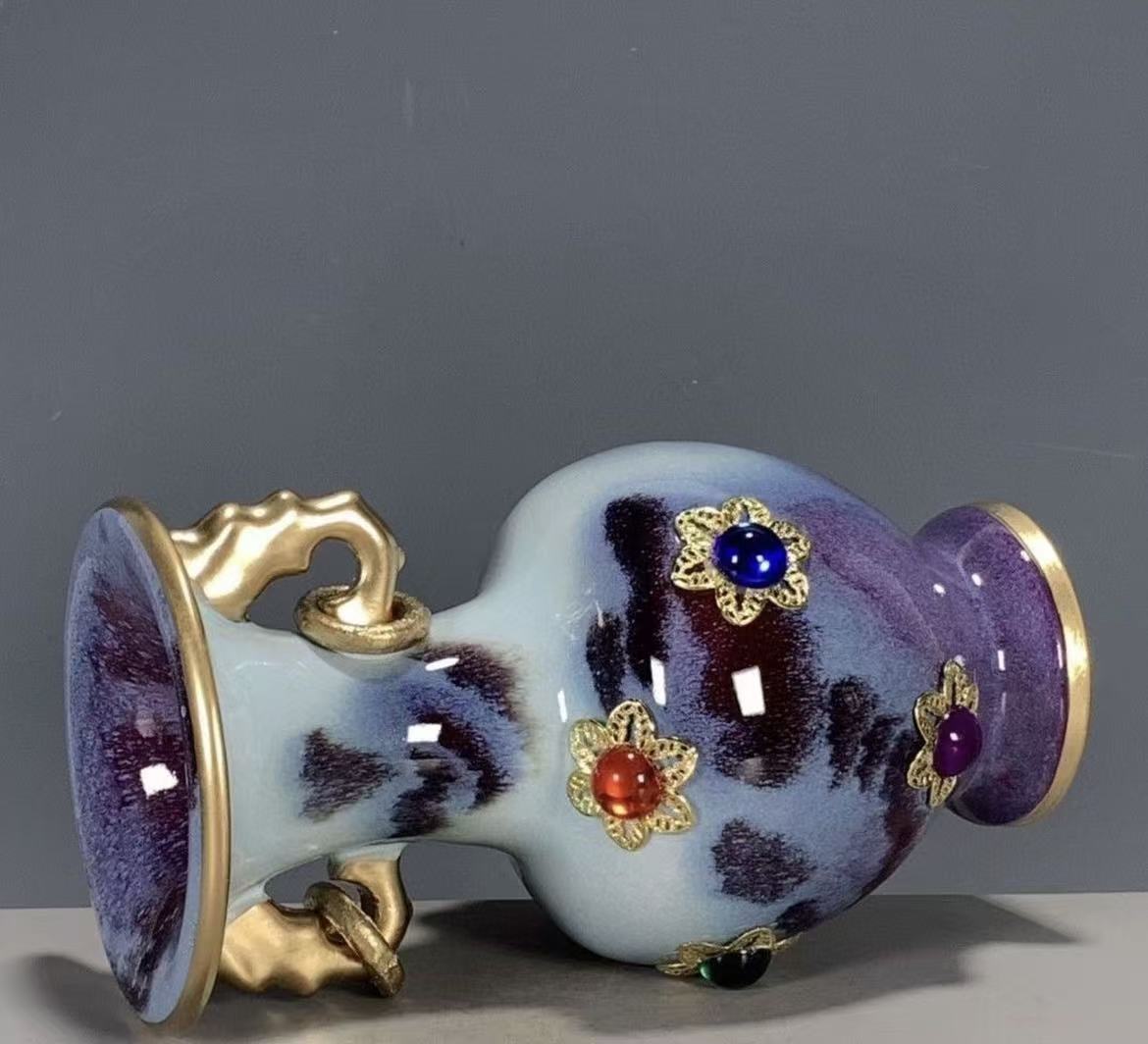 A stunning Chinese ceramic vase with a gradient kiln-transformed glaze, gilded elephant-shaped handles, and hand-set colorful gemstones. A perfect blend of traditional kiln art and opulent design, ideal for luxury home decor or gifting.
