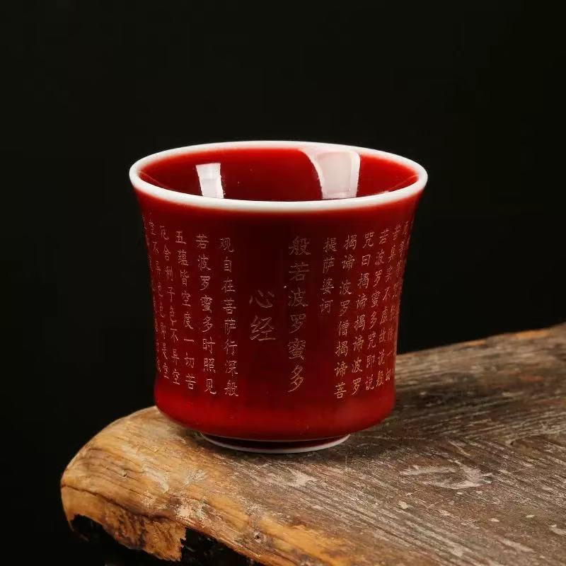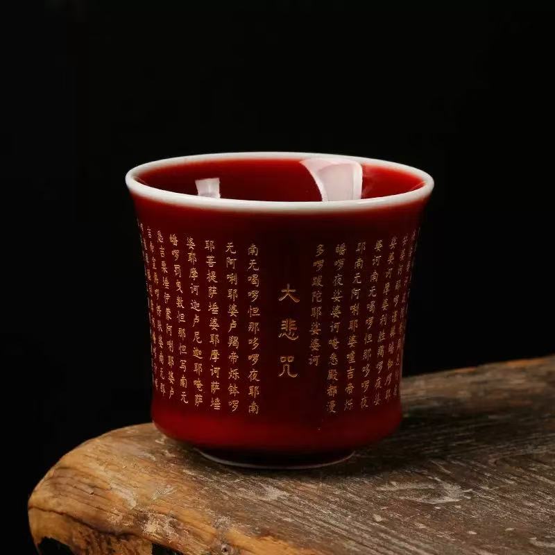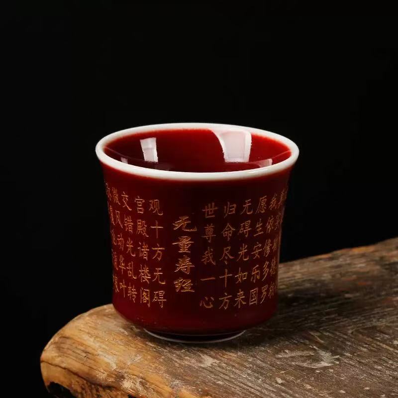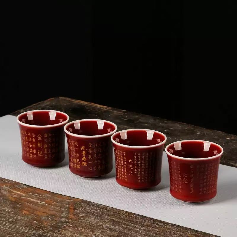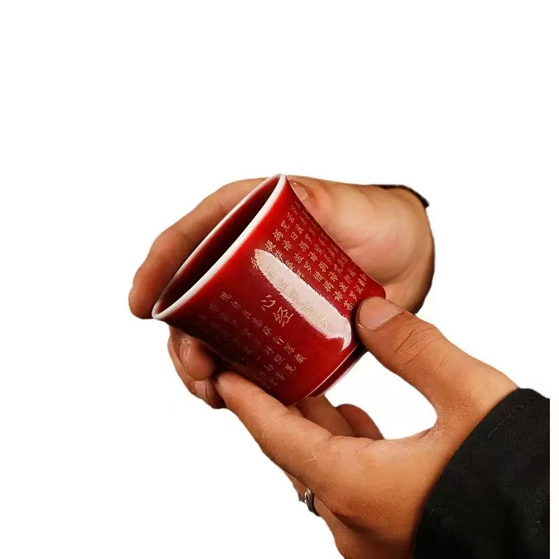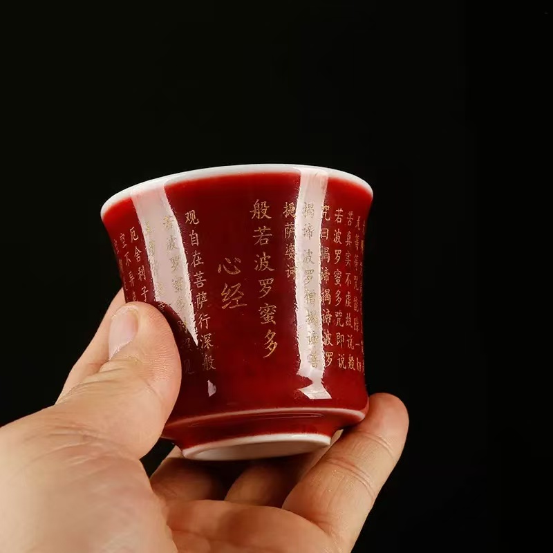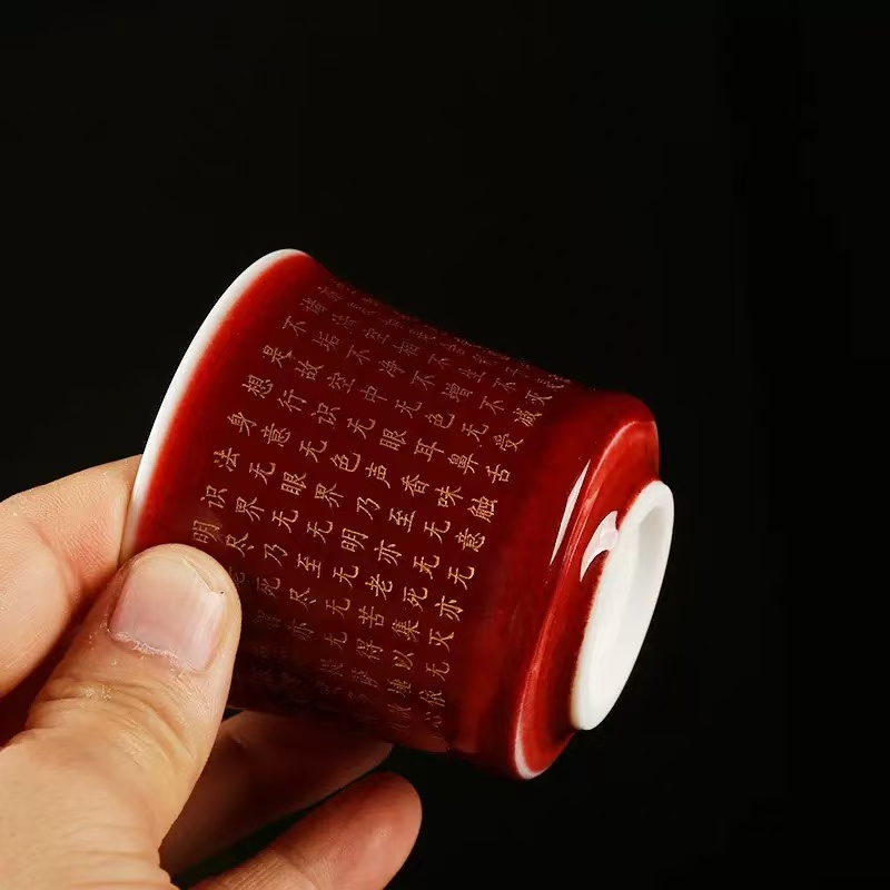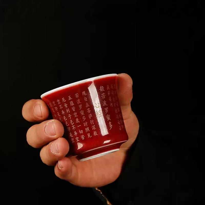 The exterior of the cup is adorned with intricate gilded inscriptions of the Diamond Sutra, a revered Buddhist text. The golden characters stand out against the deep red glaze, creating a visually stunning and spiritually meaningful piece.